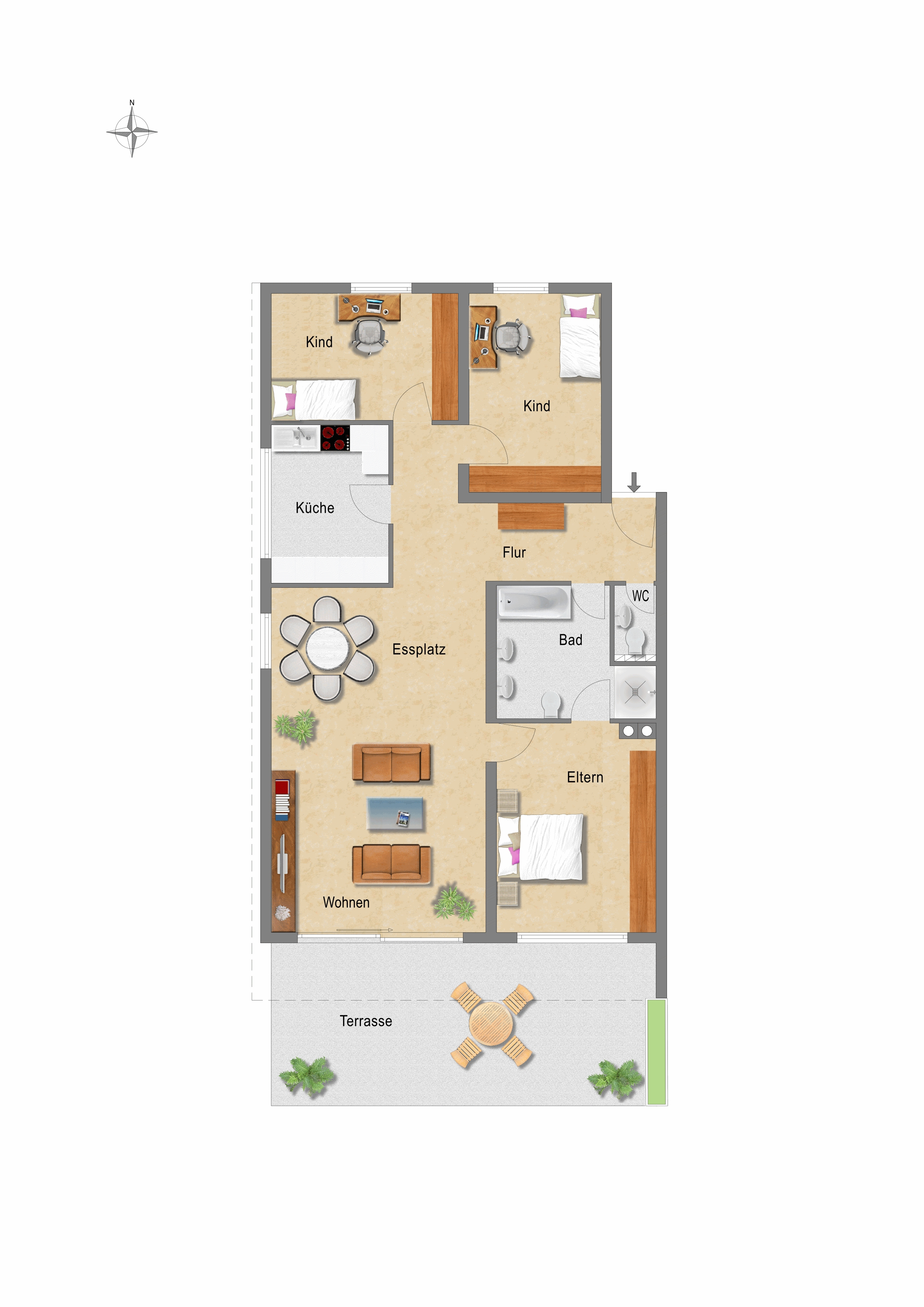 Die 4-Zimmer-Wohnung überzeugt durch eine durchdachte Raumaufteilung. Küche, zwei Kinderzimmer, ein Elternschlafzimmer mit direktem Zugang zum Bad, ein separates WC bieten ausreichend Platz für die ganze Familie. Der offene Wohn- und Essbereich bilden das Herzstück der Wohnung. Vom Wohnzimmer gelangen Sie auf die schöne und großzügige Terrasse mit Süd-Ausrichtung. Die Hanglage bietet nicht nur Ruhe und Sonne, sondern auch einen sehr schönen Blick auf das Erbacher Schloss.